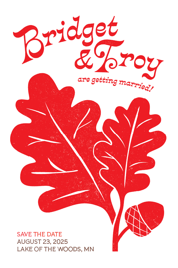 Troy and Bridget are celebrating their marriage at their beloved Laketrails Base Camp on Oak Island, MN. Fittingly, the Oak Leaf became a prominent feature of their wedding suite.